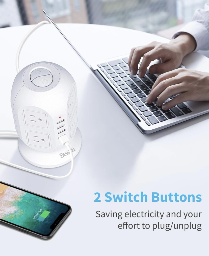 BESFAN Tower Power Strip Surge Protector, with 4 USB Ports 8 AC Outlets Charging Station Extension Cord 10 ft, Power Supply with Overload Protection for Home Office, College Essentials